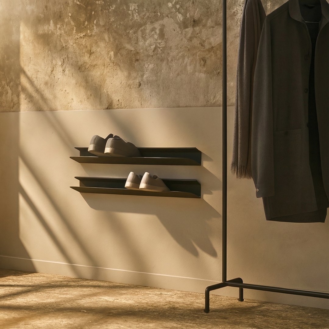 Das stahlene Schuhregal HOVER sorgt für Ordnung im Eingangsbereich mit einem minimalistischen Design und durchdachter Funktionalität. Das schlanke Stahlgestell und die tief mattschwarze Oberfläche bieten eine elegante Lösung zur Aufbewahrung von Schuhen. Erhältlich in drei Längen (79, 95 und 119 cm) und einfach übereinander kombinierbar für zusätzlichen Stauraum — ideal für kompakte Interieurs. Entworfen und gefertigt in den Niederlanden. Perfekt abgestimmt auf die Wandgarderobe RACKY für ein ruhiges, harmonisches Gesamtbild. Kostenloser Versand innerhalb eines Werktages.