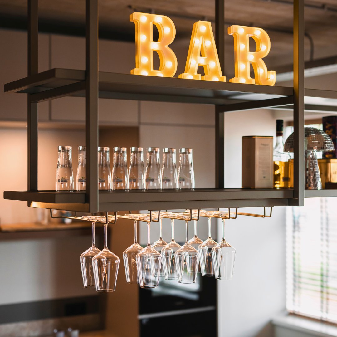 Het glazenrek bood niet alleen slimme extra opbergruimte voor flessen en glazen in de compacte keuken, maar werd ook een echte eyecatcher. Het robuuste en strakke design sluit perfect aan bij de warme, luxe uitstraling van de bar.