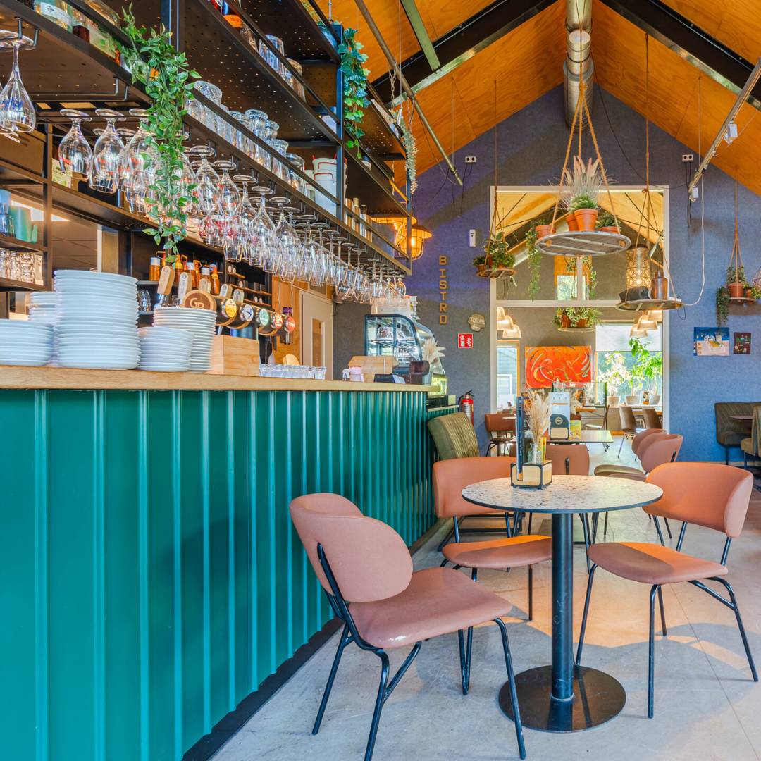 Een stijlvolle, functionele bar die naadloos aansluit bij het interieur. Met groene golfplaten, een eiken blad en een stalen achterwand vormt de bar het warme en eigentijdse hart van de bistro.